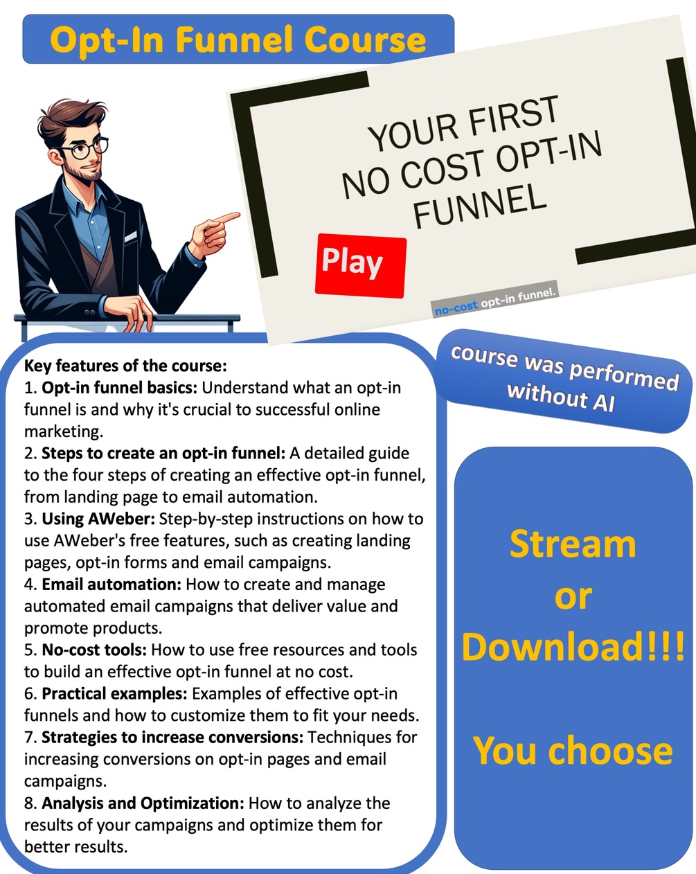 - No cost: You'll learn how to build an entire opt-in funnel system at no cost using free tools and resources.