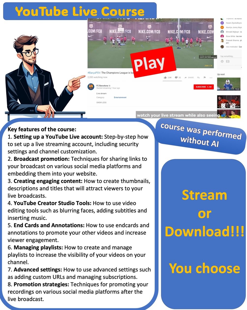- Comprehensive approach: the course covers all aspects of successfully using YouTube Live, from account setup to advanced promotion techniques.
